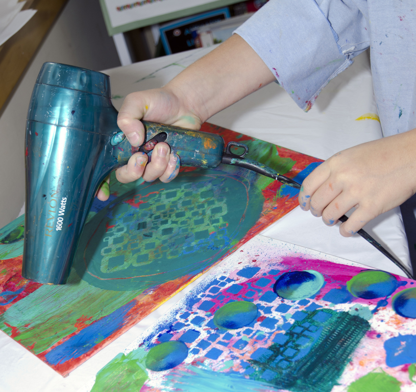 Once the first layer is completely dry, use cool colours to create as many kinds of marks and designs on top.
