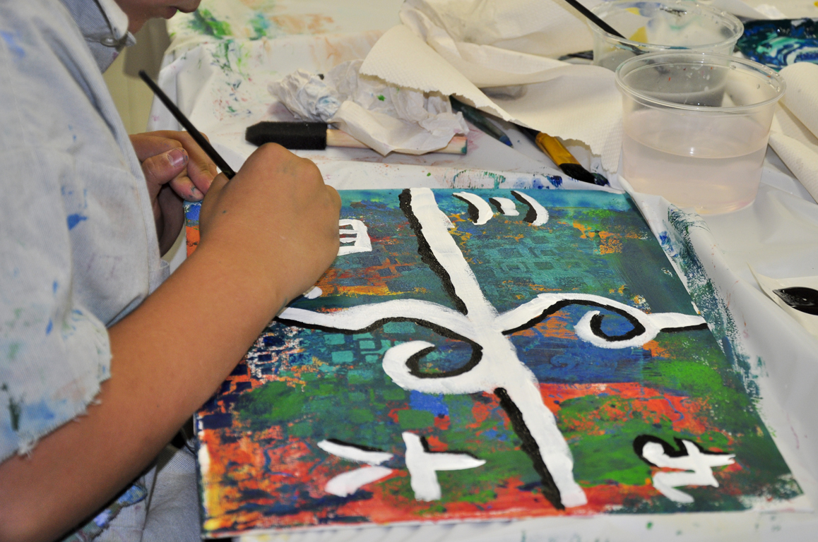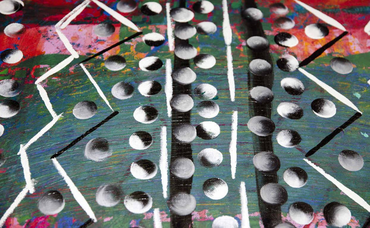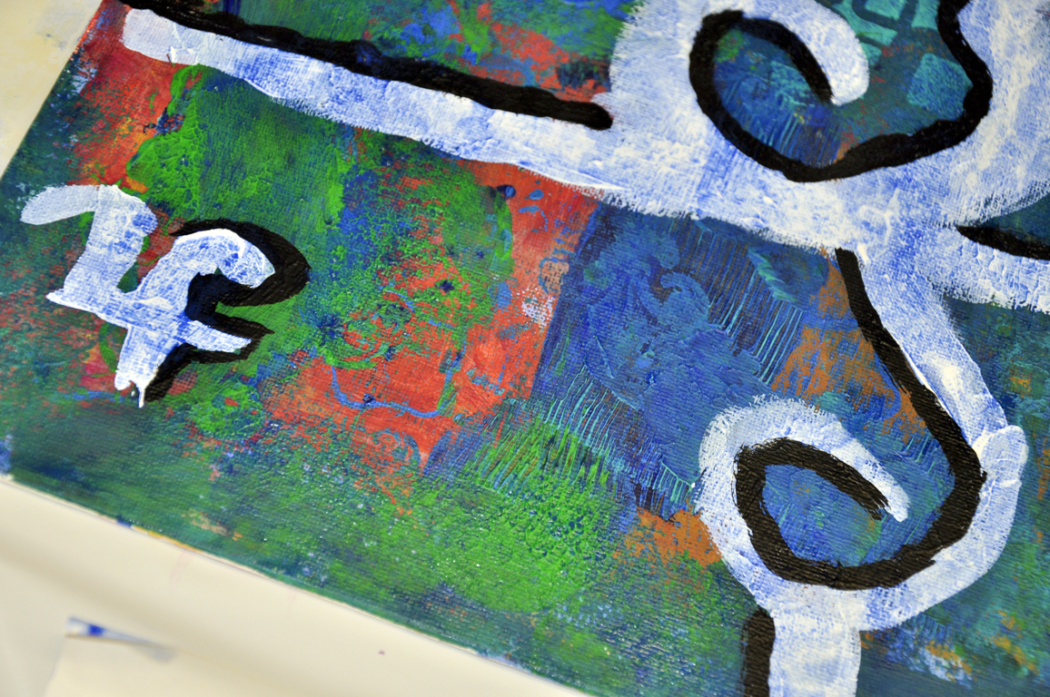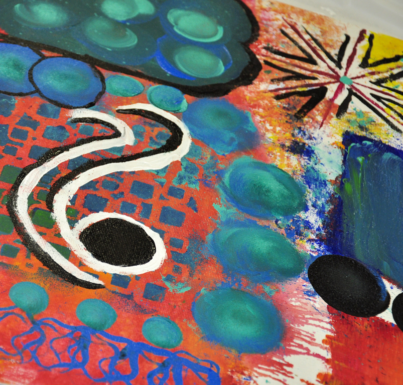 Use white and black (side by side for increased visual intensity) to add more marks or designs if you want to stay abstract, or to start building your subject if one is already calling you.