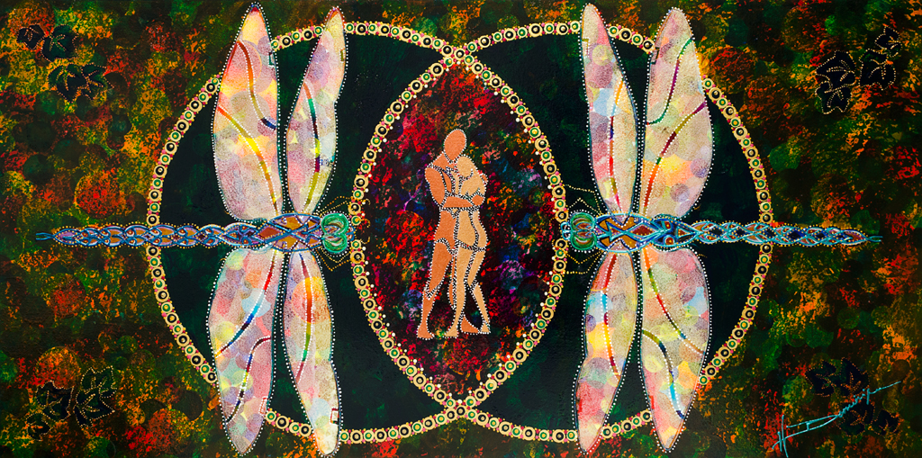 The very creation of this painting was romantic. It gave me its name soon after the vision popped into my mind. I hadn’t even finished varnishing my other dragonfly painting, “Aligned“, when this one called me to join with it for a magical few days of play.